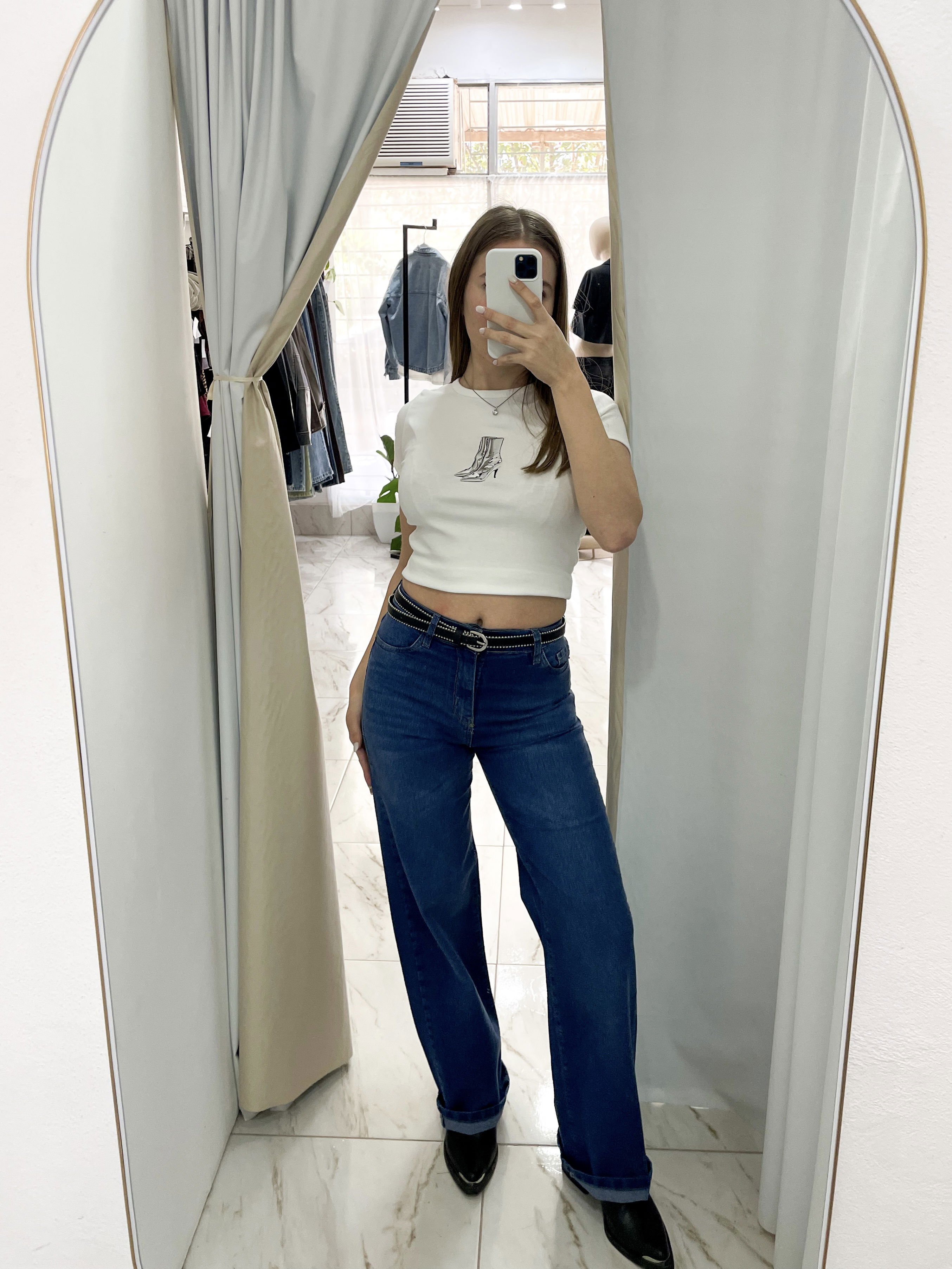 Jeans elastizado, con corte recto y tiro alto.