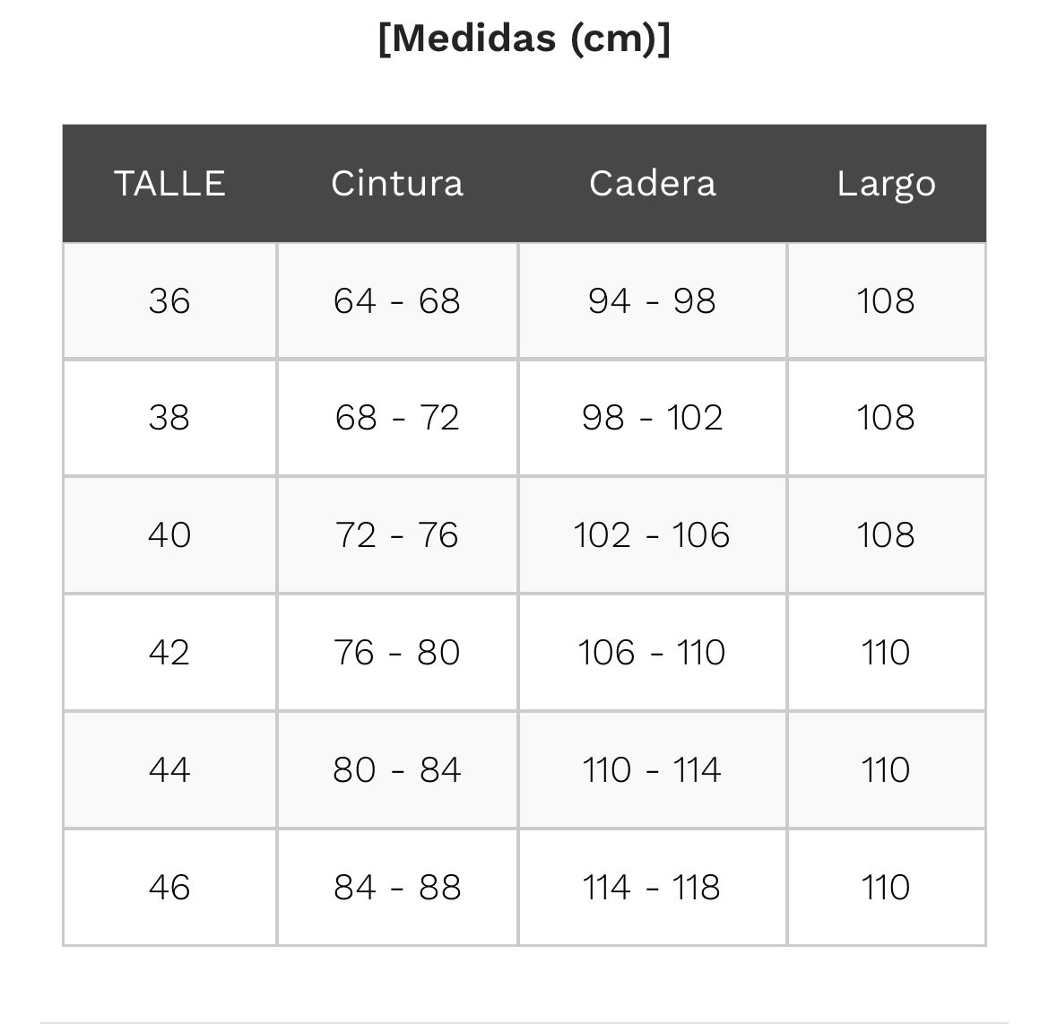 Tabla de talles en la última foto