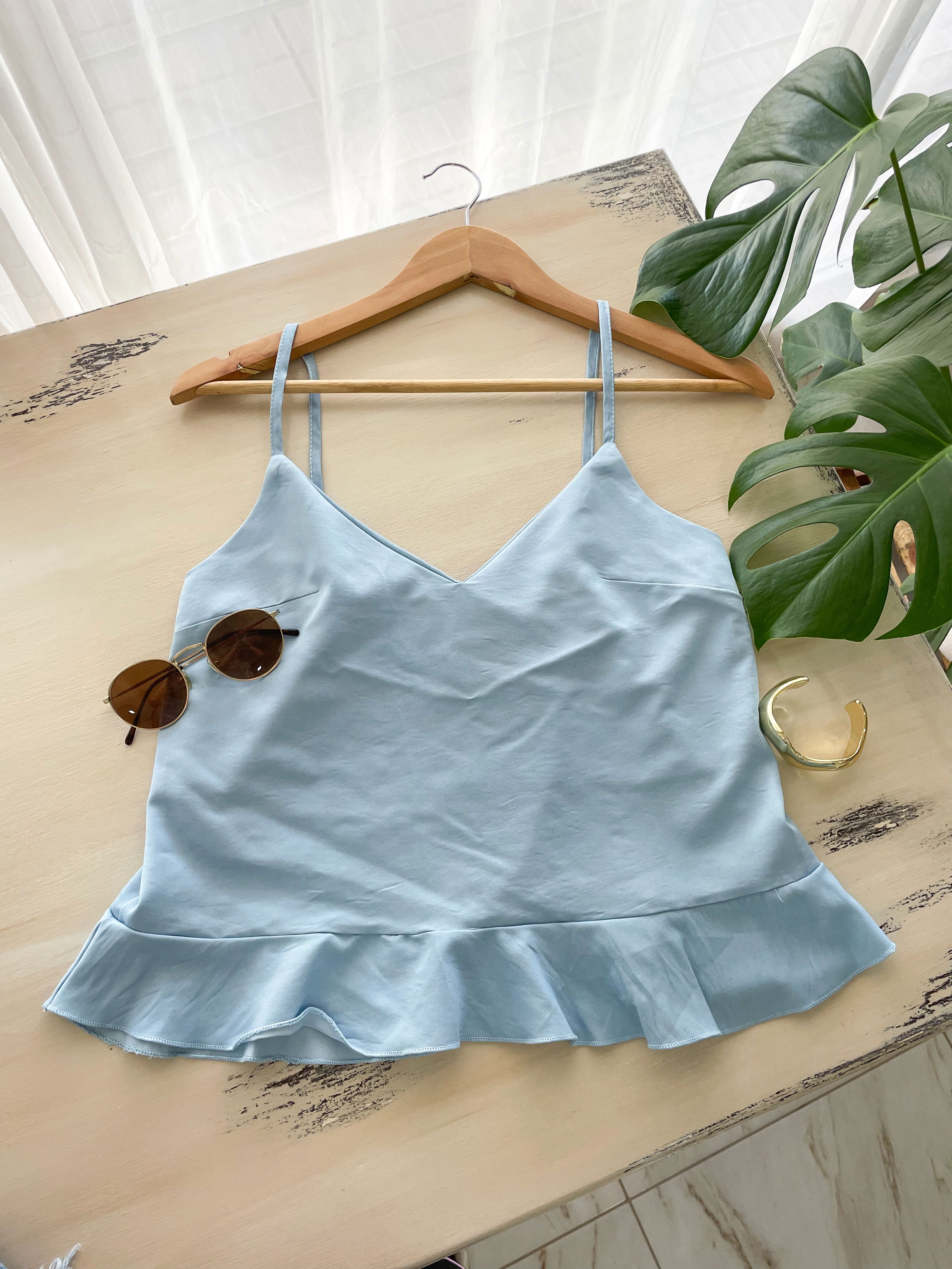 Blusita escote V con voladitos en la parte inferior, tiene elástico en la espalda y doble tela en el busto.