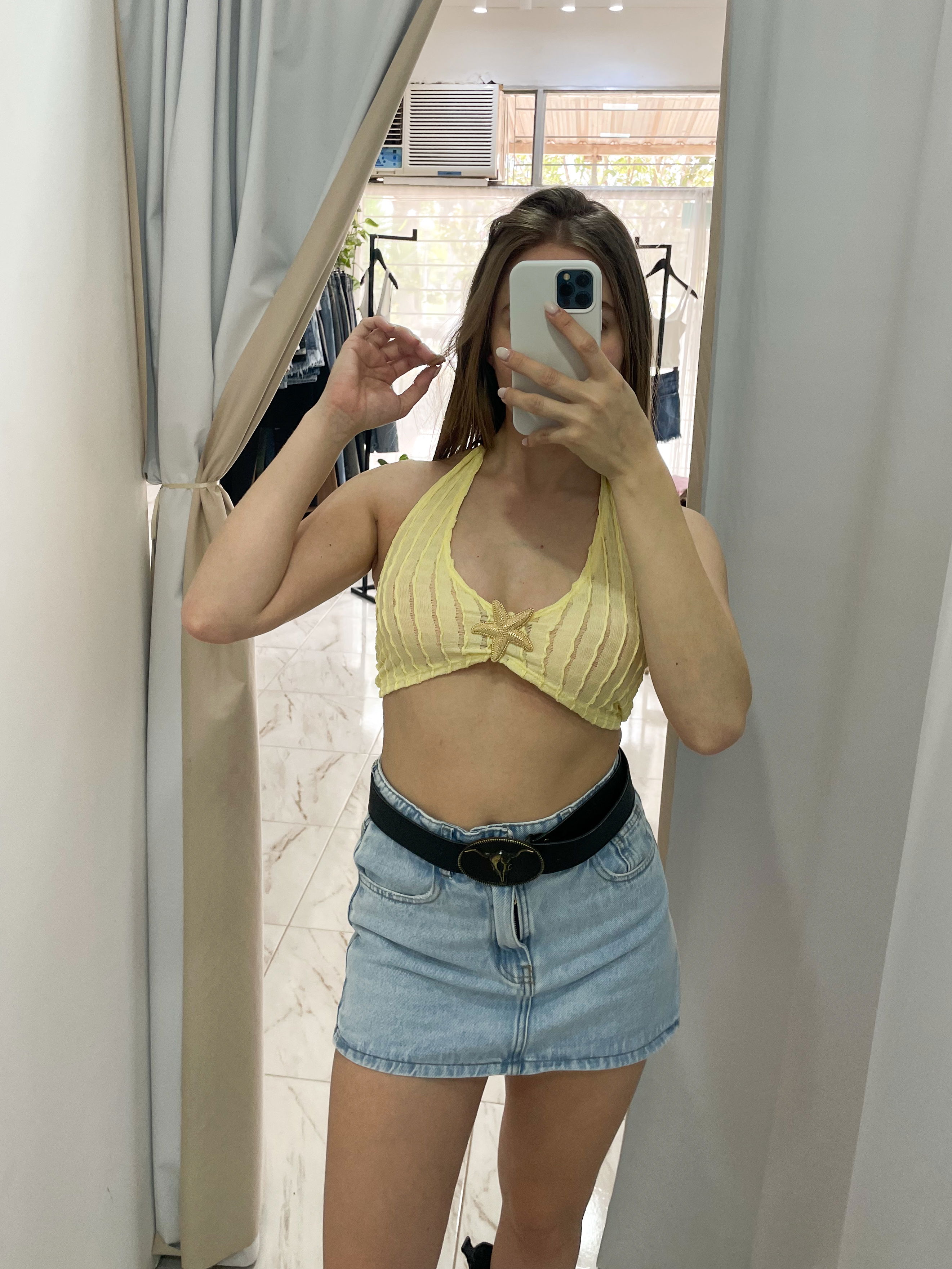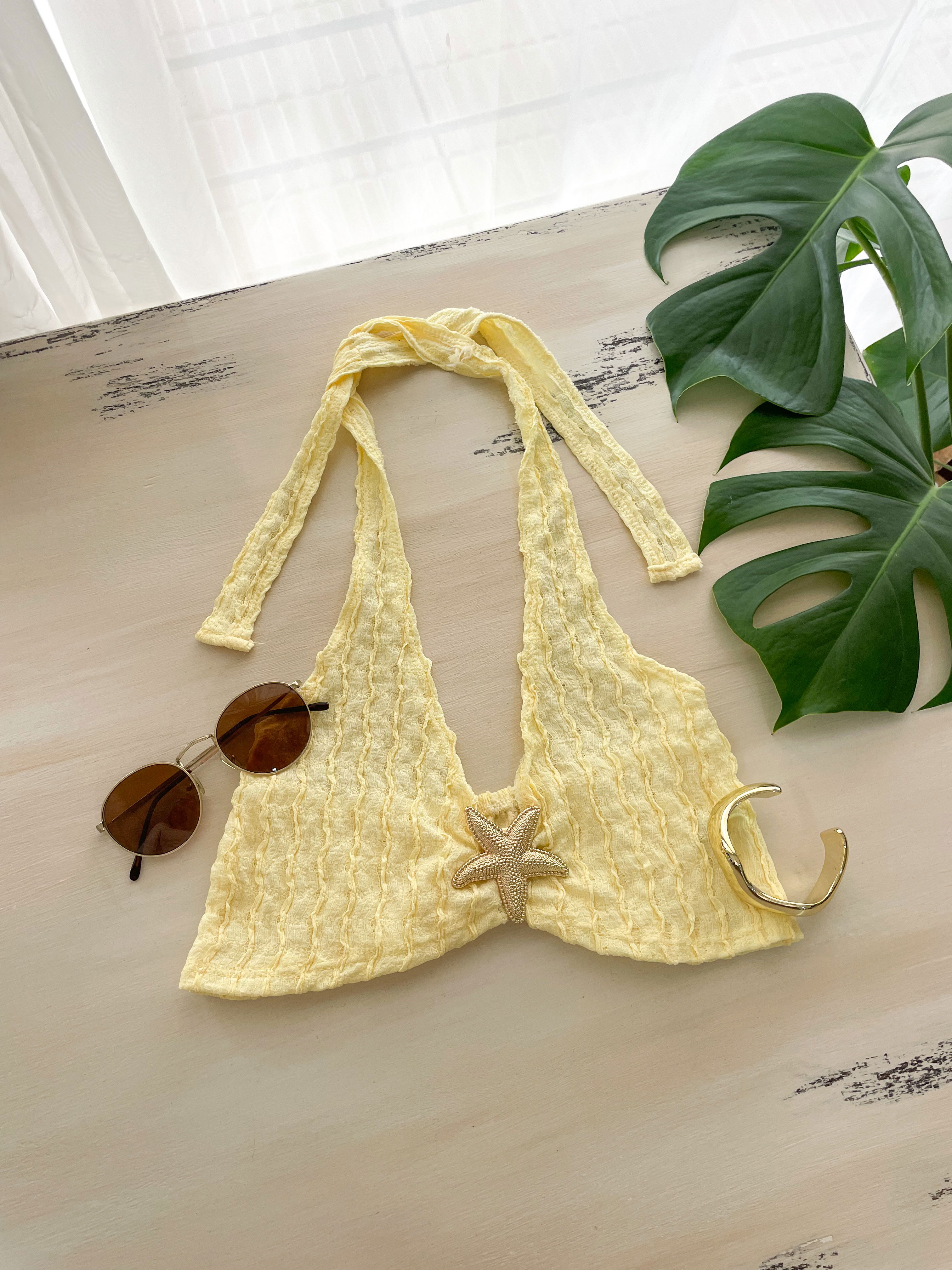 Top escote V confeccionado en tela hawaii , con aplique dorado "estrella de mar" y tiras para atar en cuello.