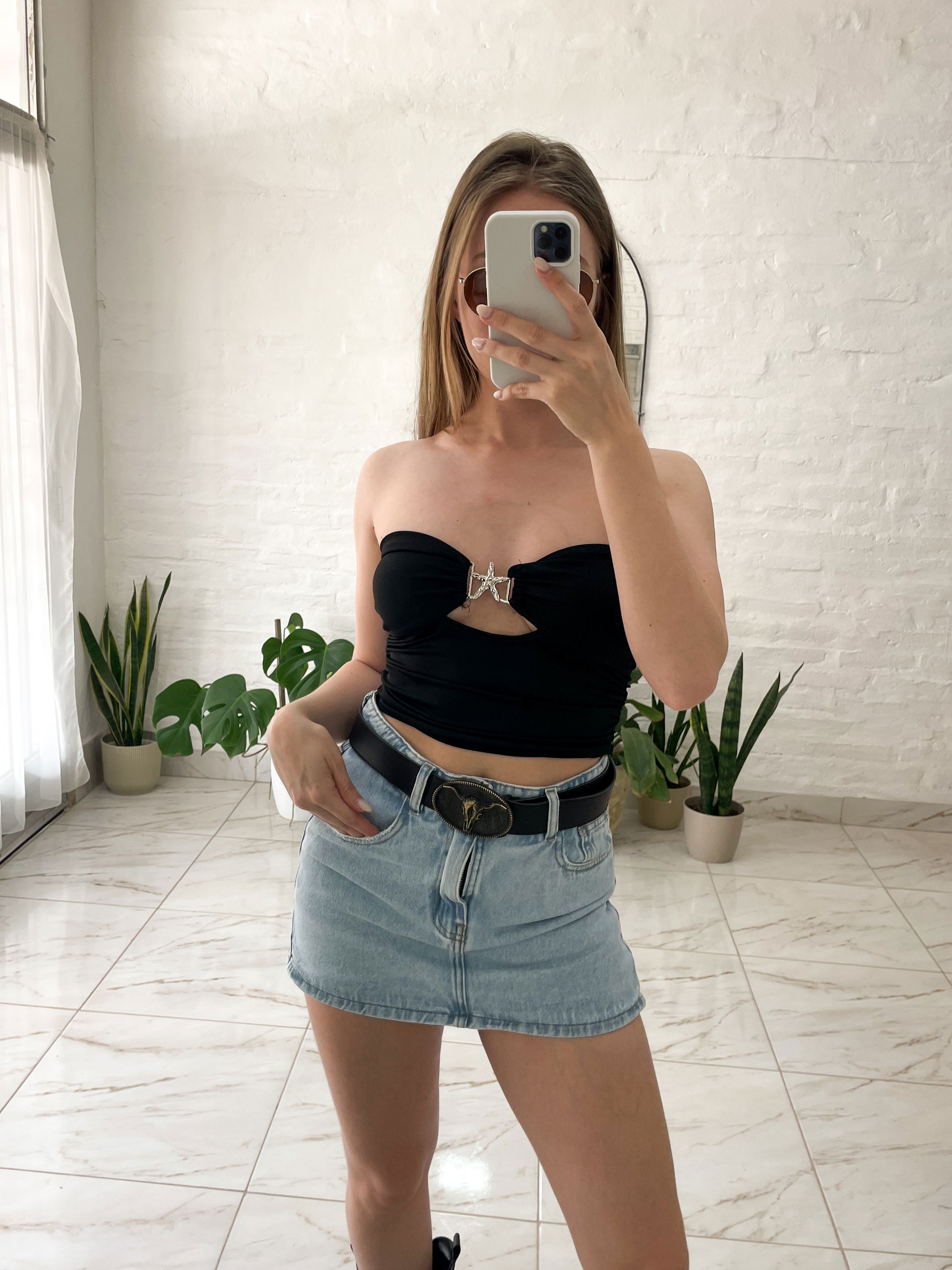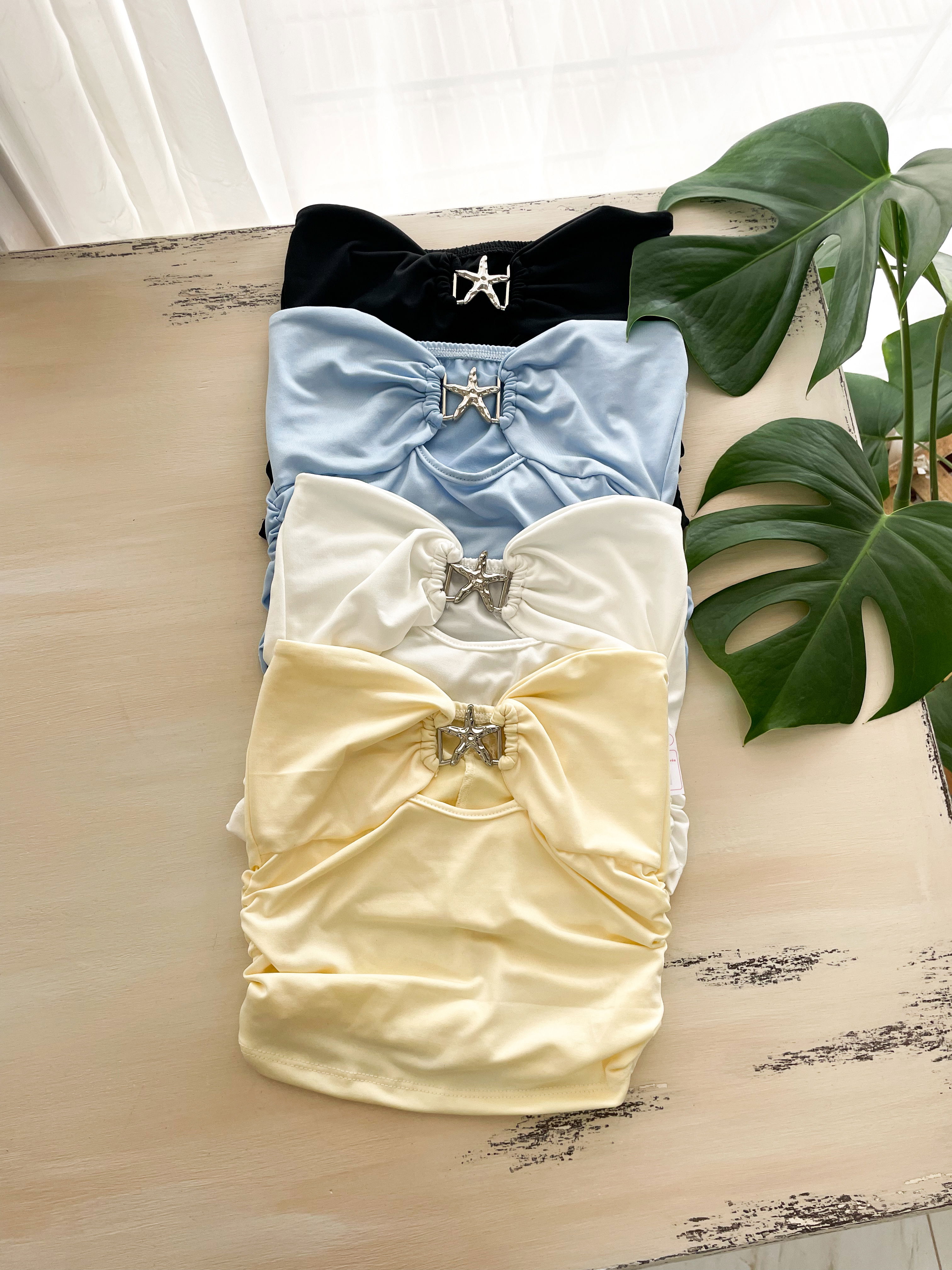 Top strapless confeccionado en tela de microfibra, con aplique de estrella de mar y doble tela en el busto (no transparenta)