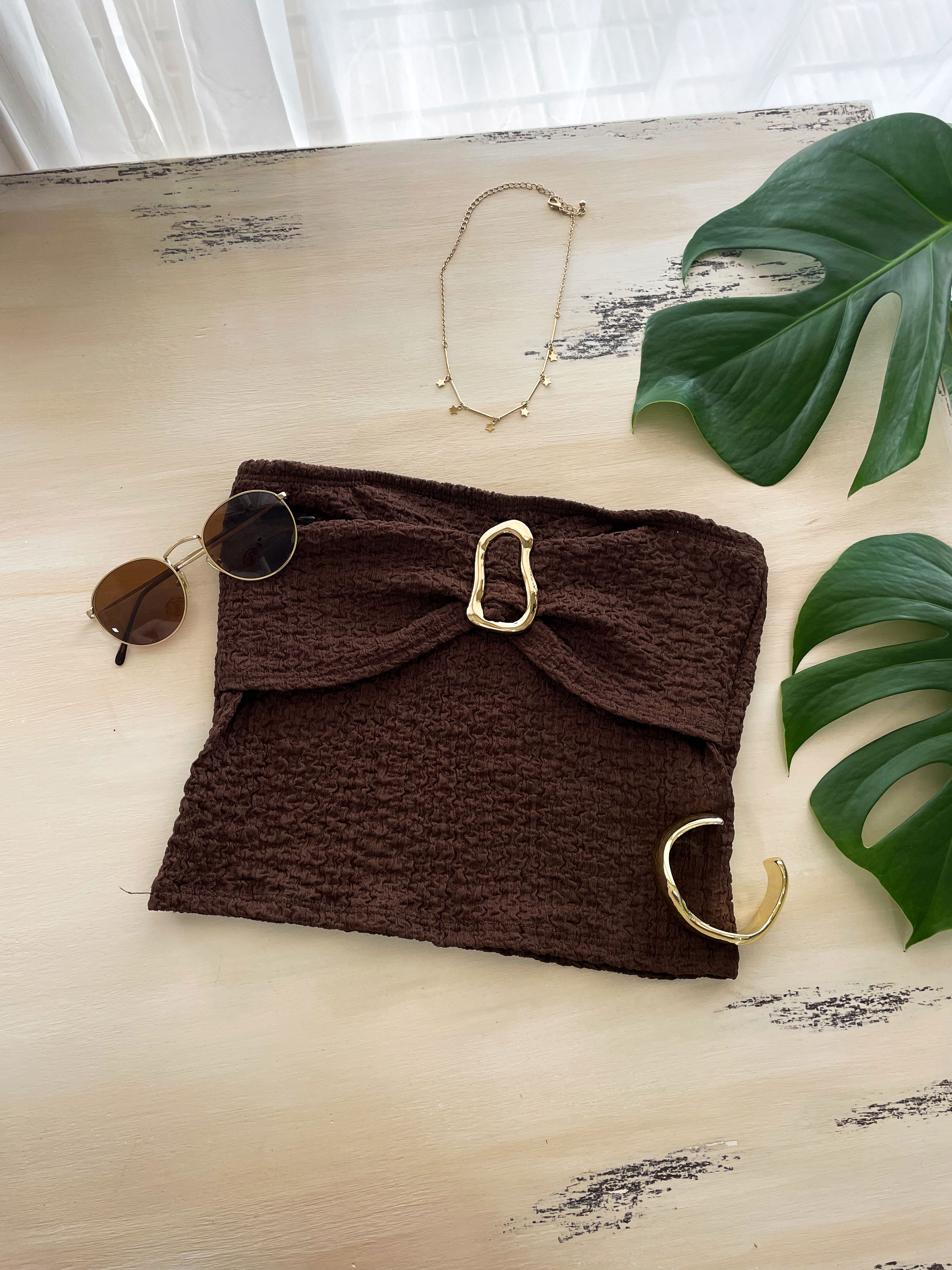 Top strapless confeccionado en tela hawaii , con aplique dorado