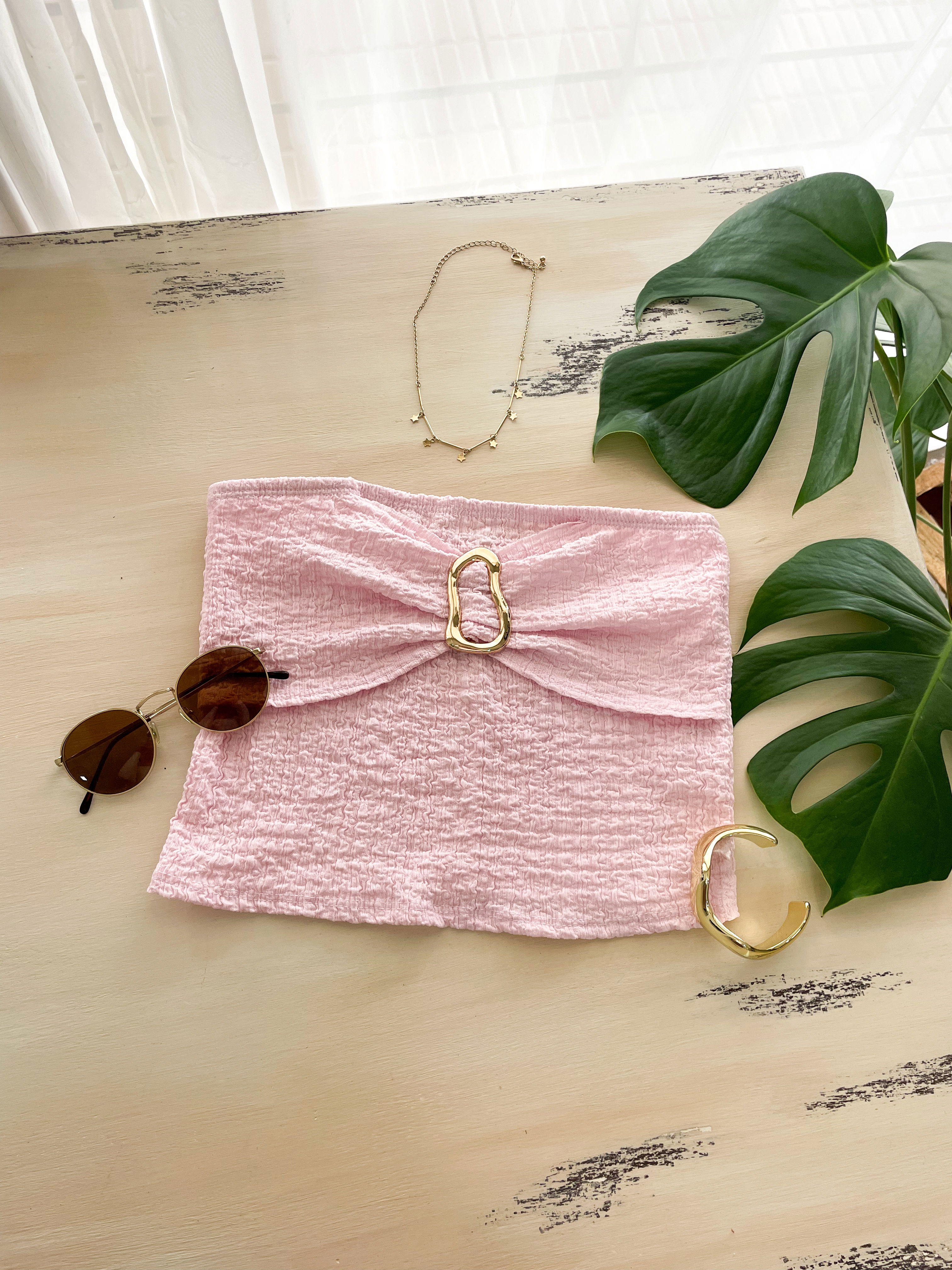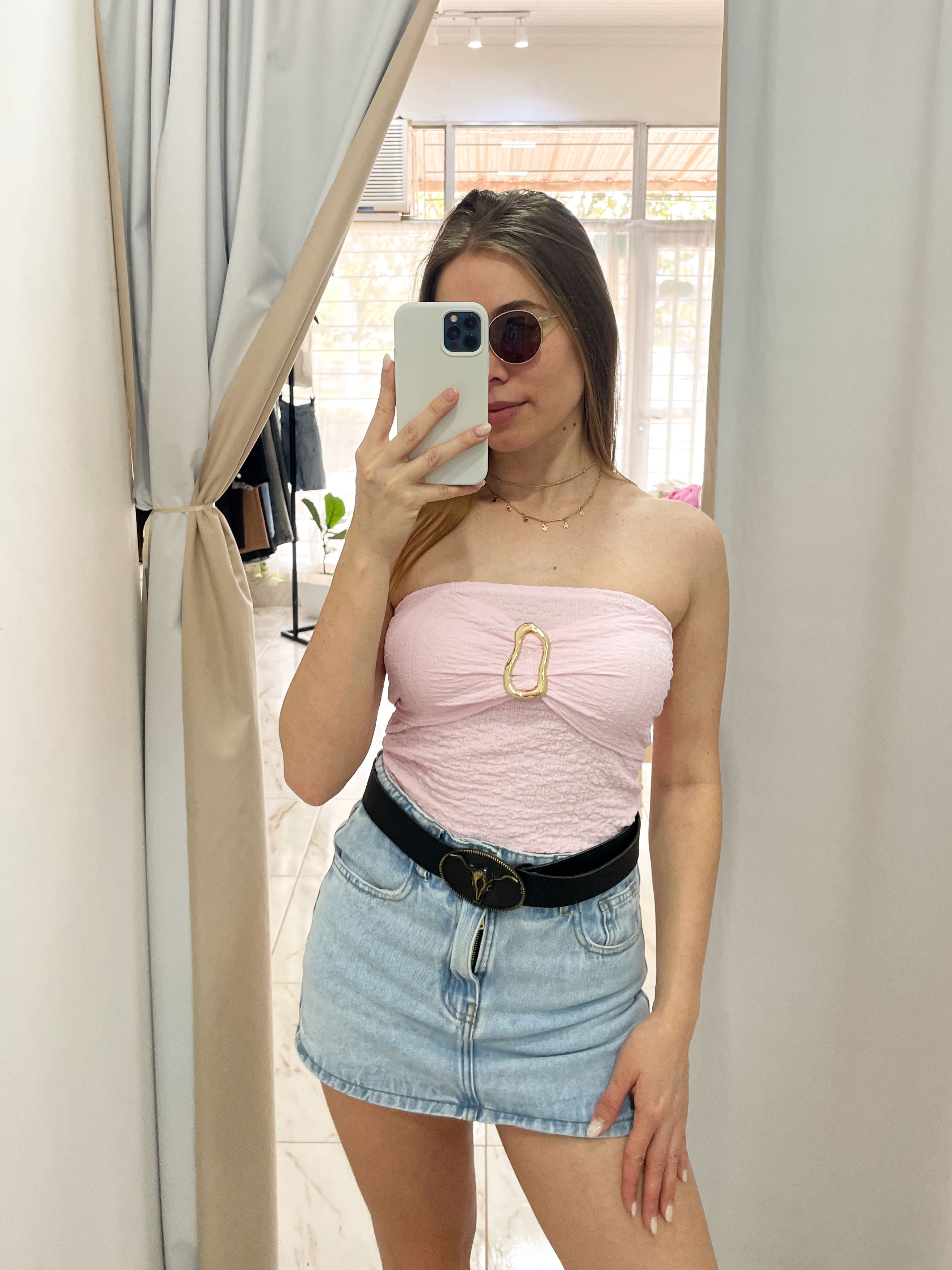 Top strapless confeccionado en tela hawaii , con aplique dorado