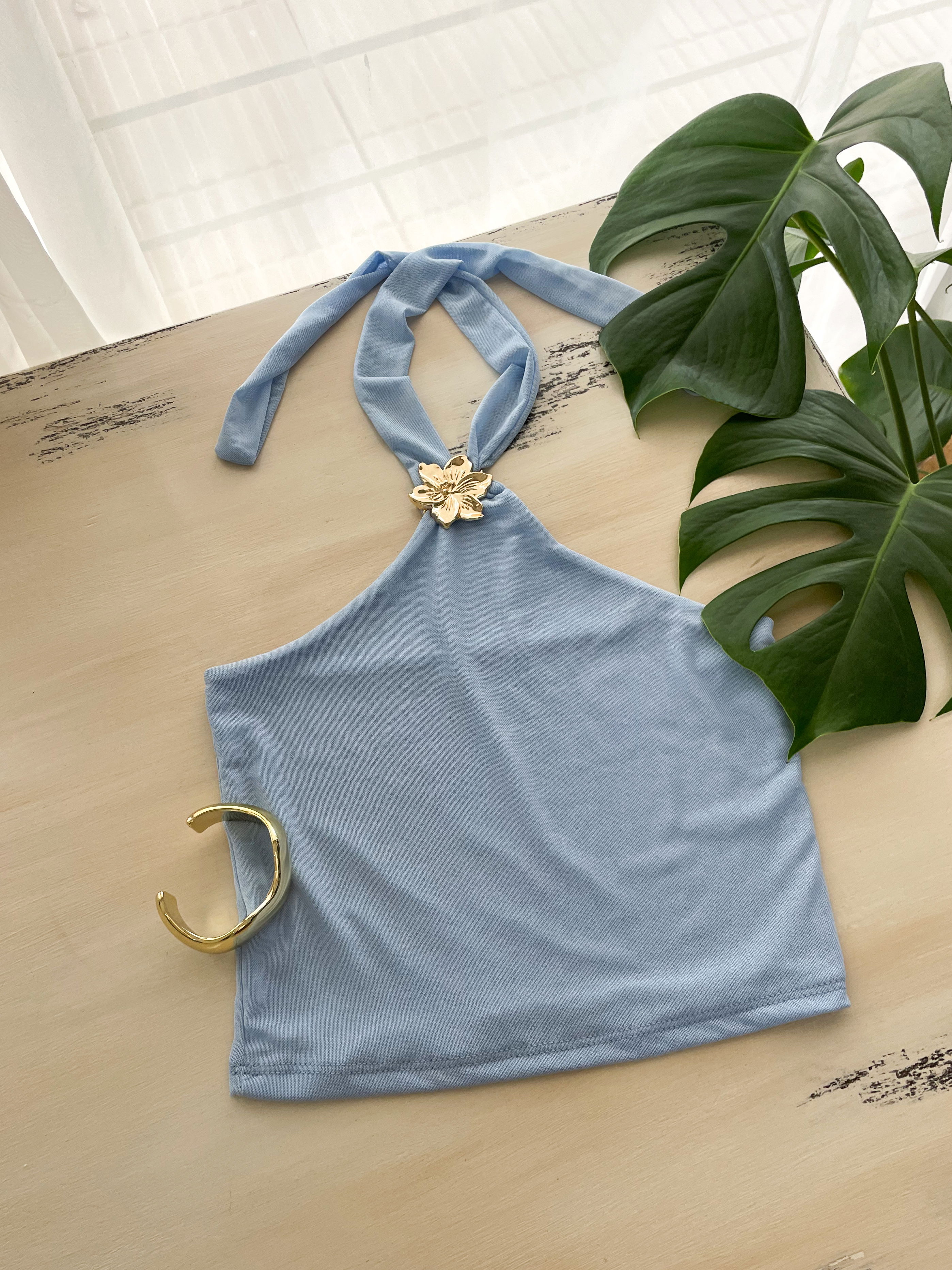 Top confeccionado en tela de microtul, con forro (no transparenta) y tiras de microtul para atraer en cuello.