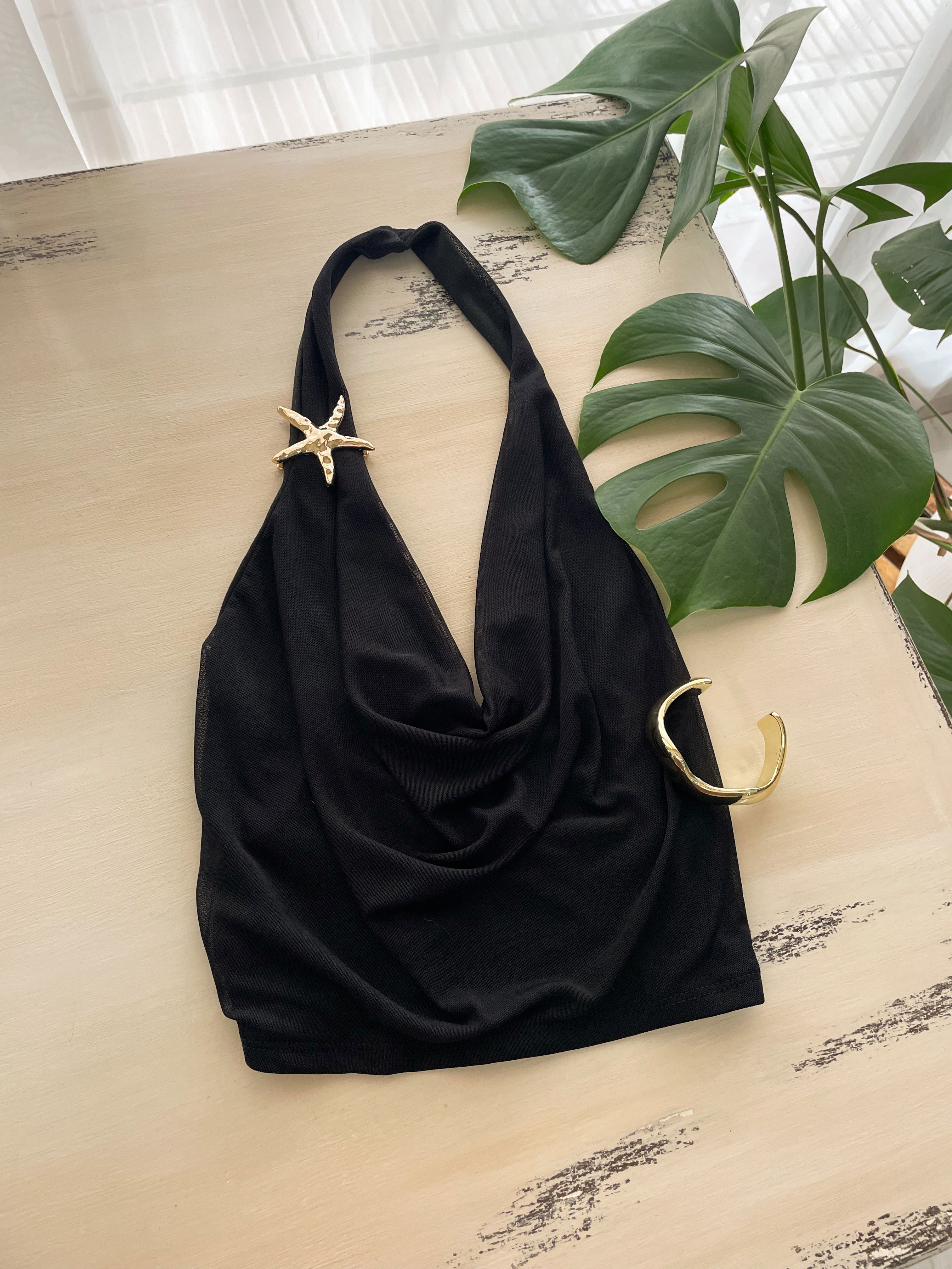 Top escote buche confeccionado en tela de microtul, con forro (no transparenta) y tiras para atar en espalda