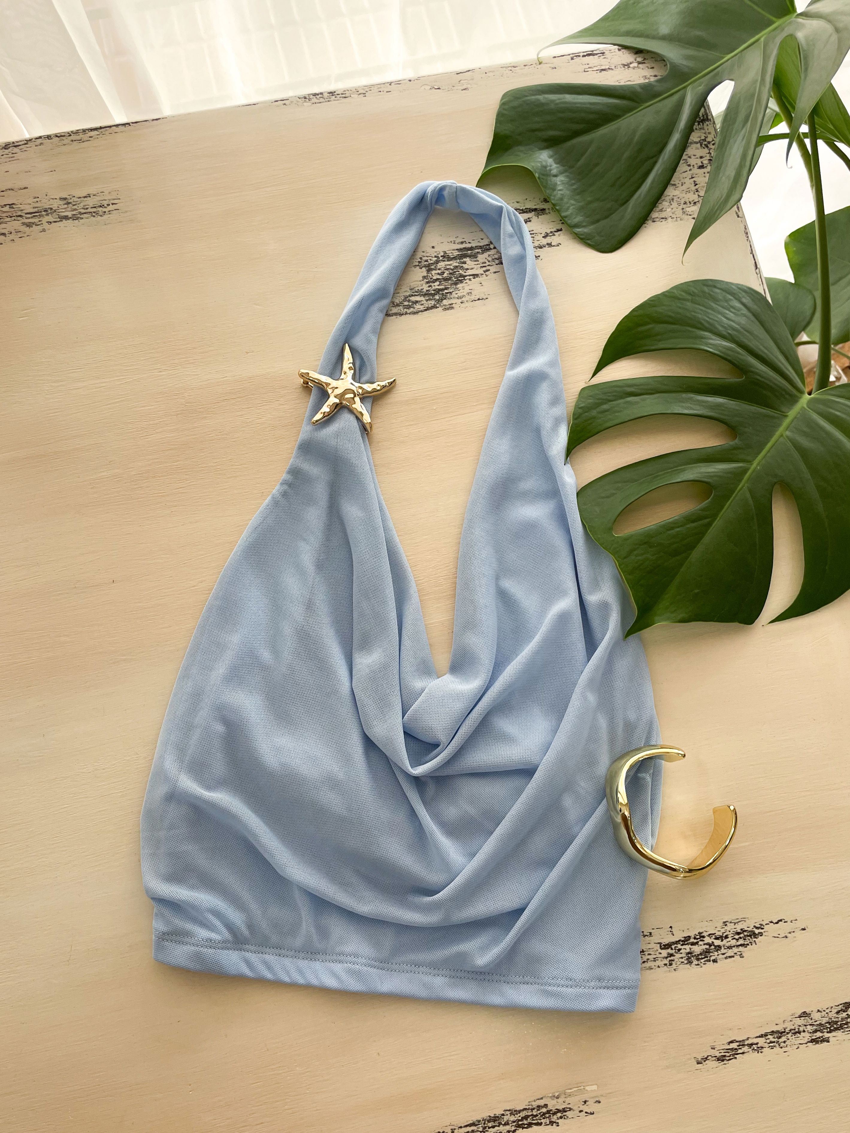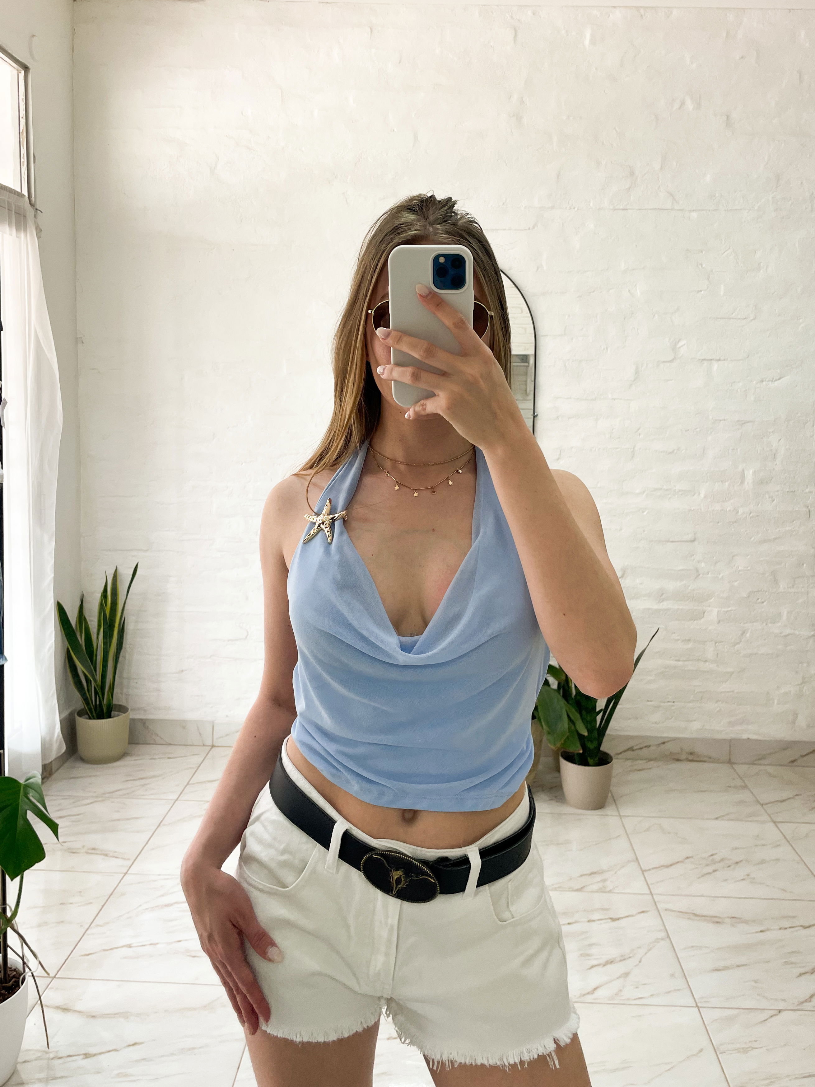 Top escote buche confeccionado en tela de microtul, con forro (no transparenta) y tiras para atar en espalda