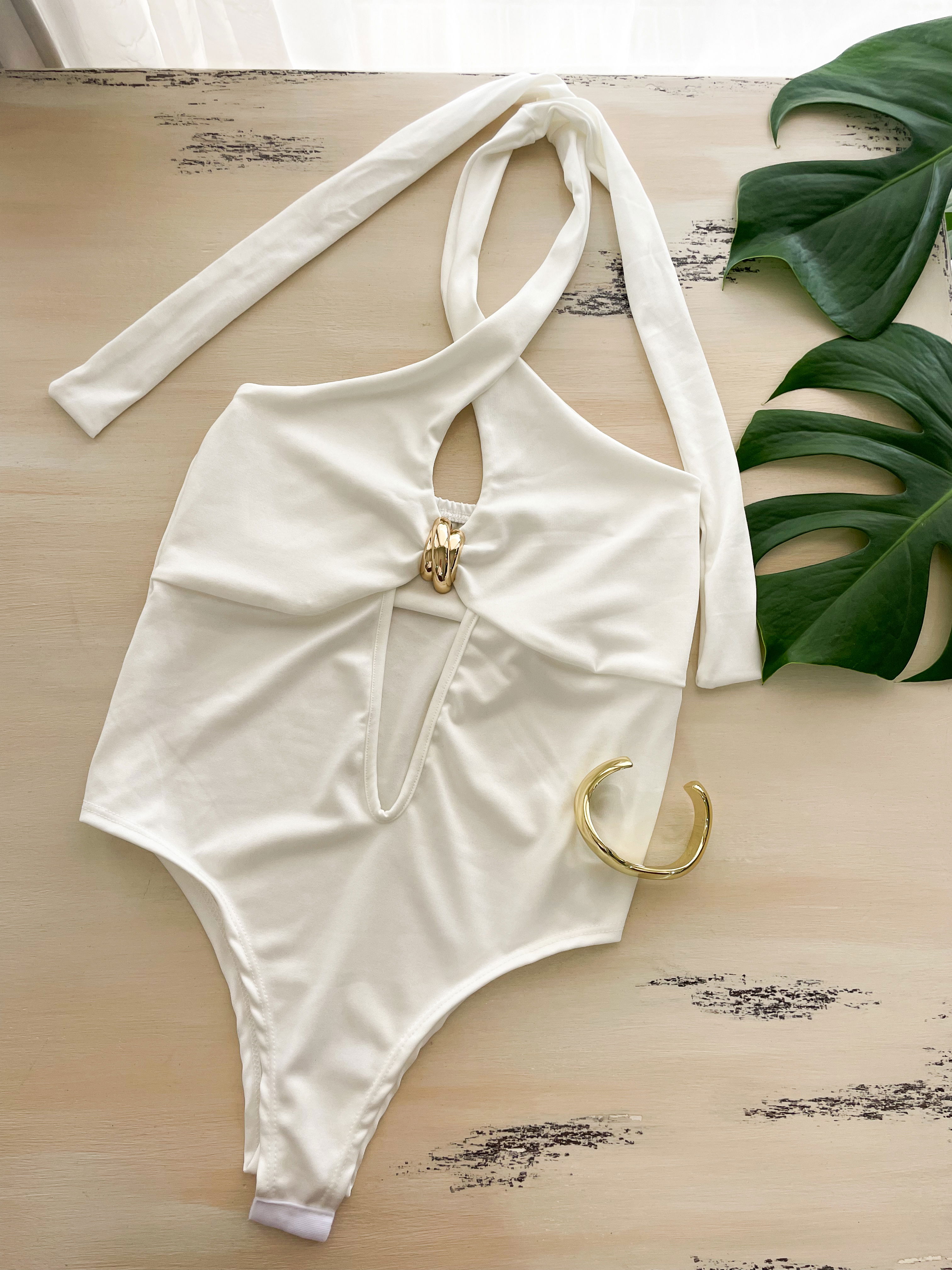 Body confeccionado en tela de microfibra, con detalle dorado. Doble tela en el busto. Broches en la parte inferior