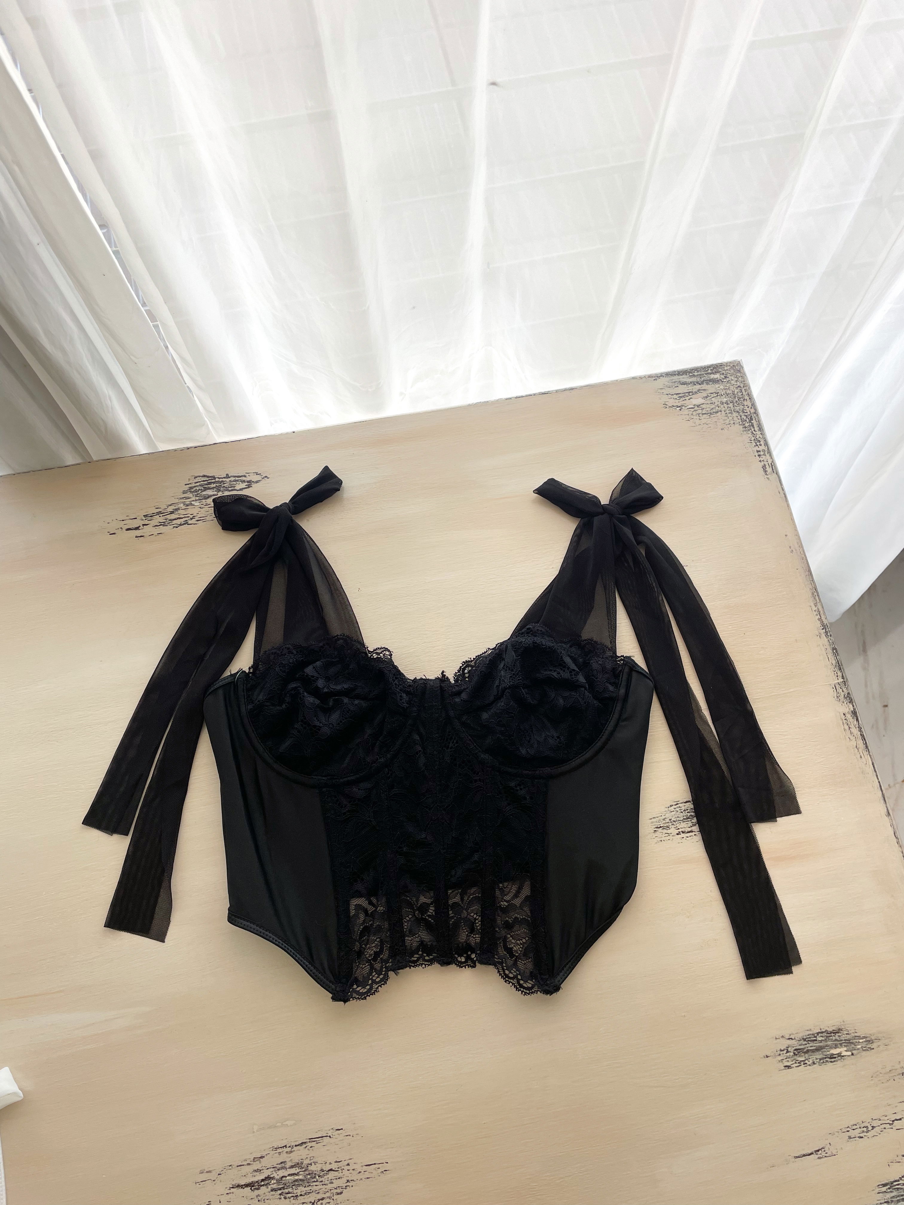 Corset de encaje con tiras de microtul para atar en hombros. Tela elastizada.